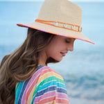 Make a splash this season with the Riviera Hat, your must-have accessory for sunny getaways and beach-bound days. Its wide brim is trimmed with playful pink and orange raffia that brings a burst of color to any outfit. A row of natural cowrie shells wraps around the crown, adding a breezy, tropical feel. Whether you're strolling seaside or lounging poolside, this hat keeps your style cool and carefree.