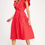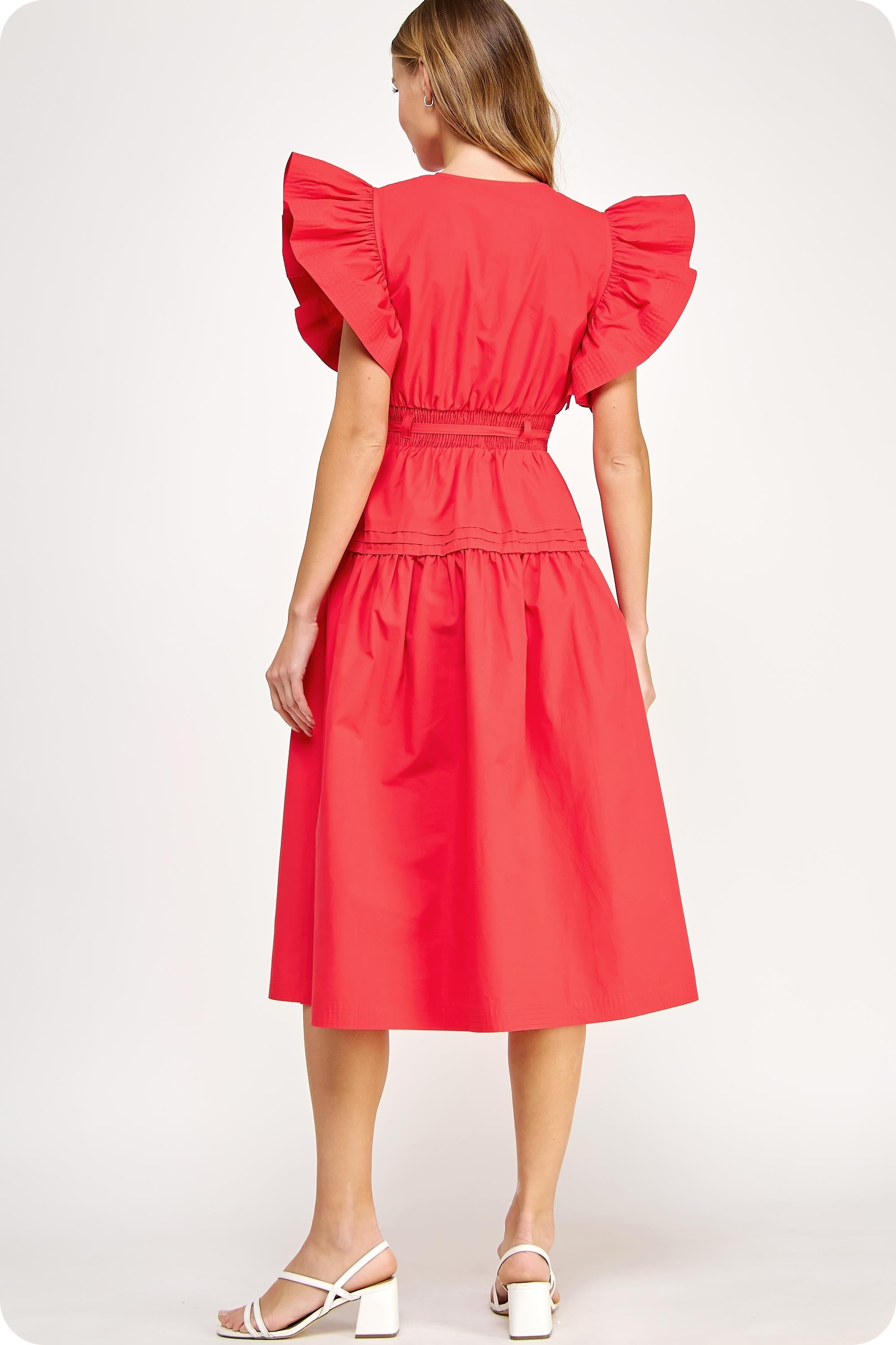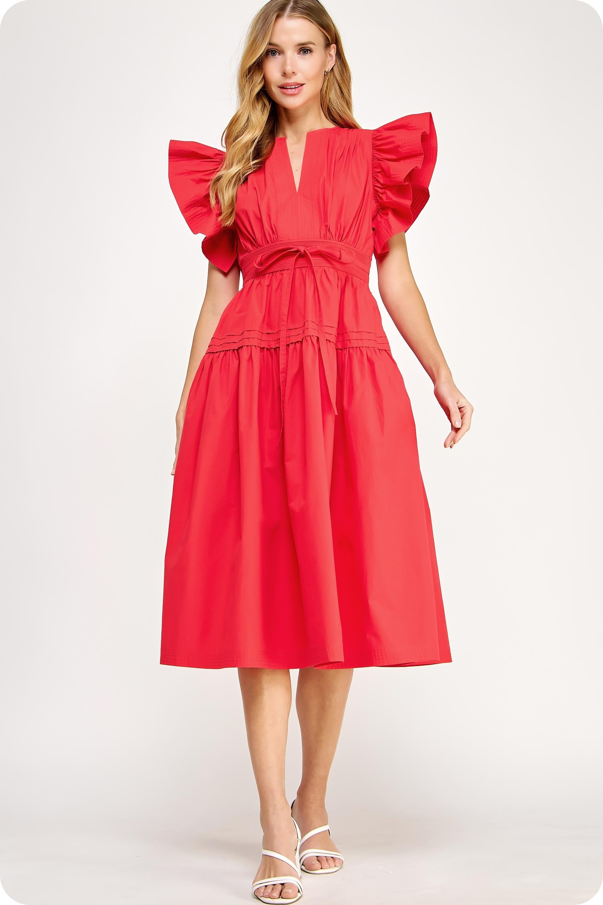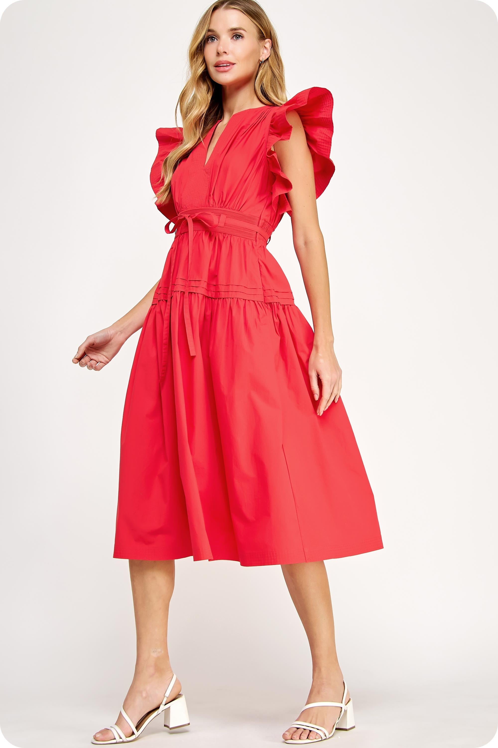 Flutter sleeve midi dress in cotton poplin fabric. This long dress features fluttered ruffle short sleeves with top stitch detail, a split V-neck, side pockets, midi skirt, side zipper closure, pintuck detail at shoulder/skirt, a removable waist tie, and cinched banded waist with stretch smock at back