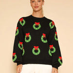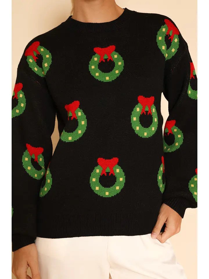 Celebrate the season in style with this cozy knit sweater featuring an all-over wreath intarsia design. The classic round neckline and original artwork make it a standout piece perfect for holiday gatherings or everyday wear. Crafted with care, this sweater combines comfort with festive charm.