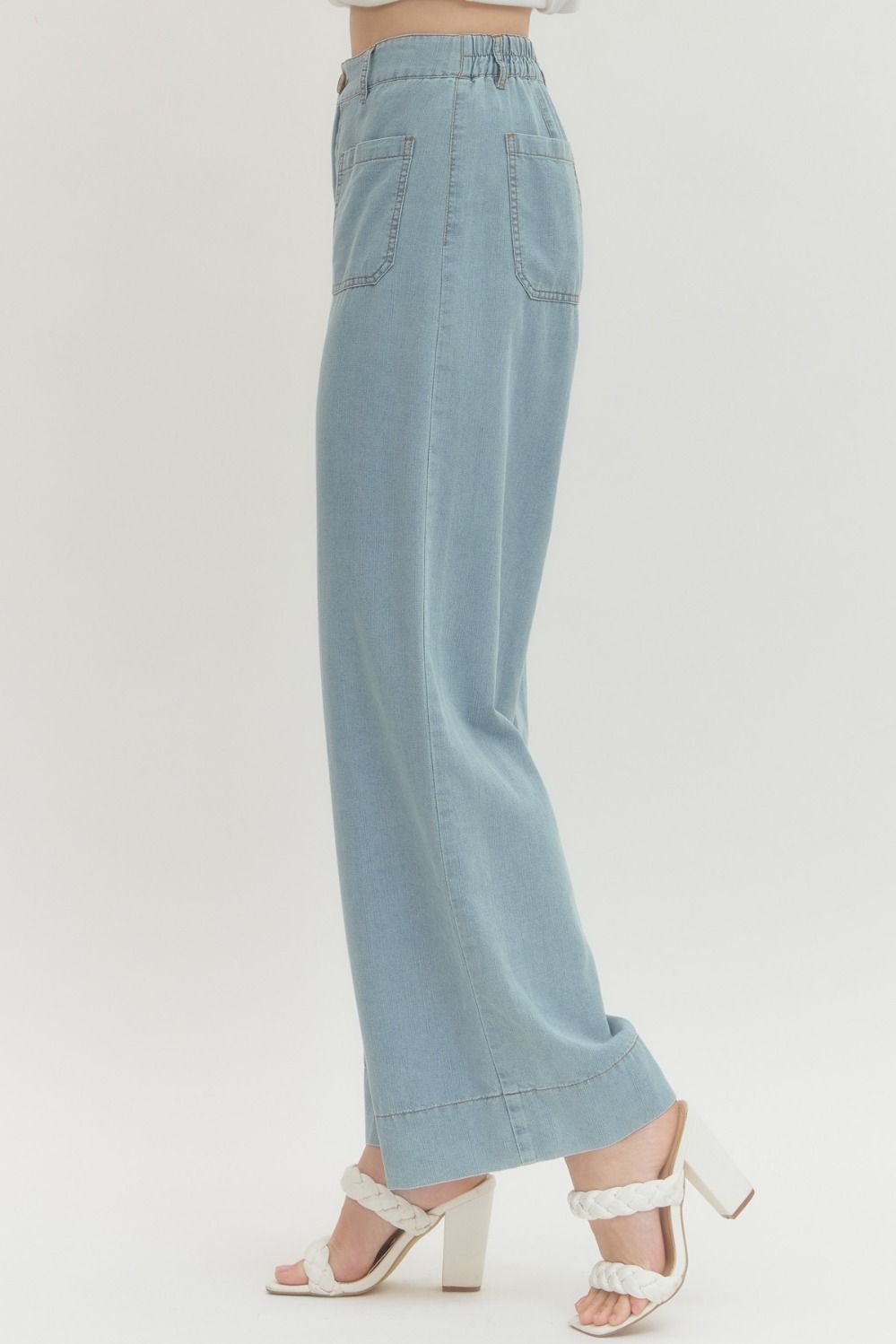 Denim wide leg pants featuring front patch pockets and stitched waistband. Zip-fly with button closure. Back elasticized waist for comfort. Back patch pockets. Unlined. Woven. Non-sheer. Lightweight.