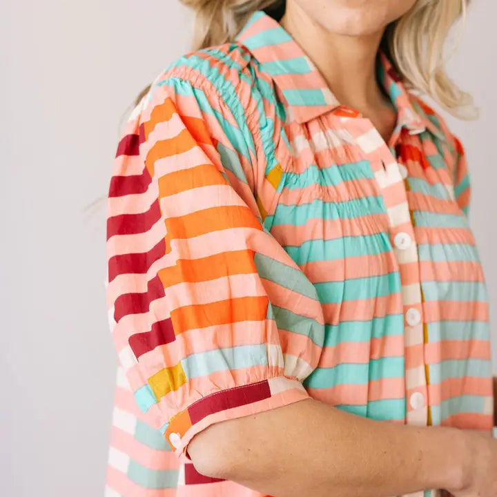The Apricot Colorful Stripe Oasis Dress adds a playful twist to classic elegance with its vibrant stripe pattern and breezy maxi silhouette. Featuring puff sleeves and a button-front design, this dress is perfect for warm, sunny days or lively summer evenings.