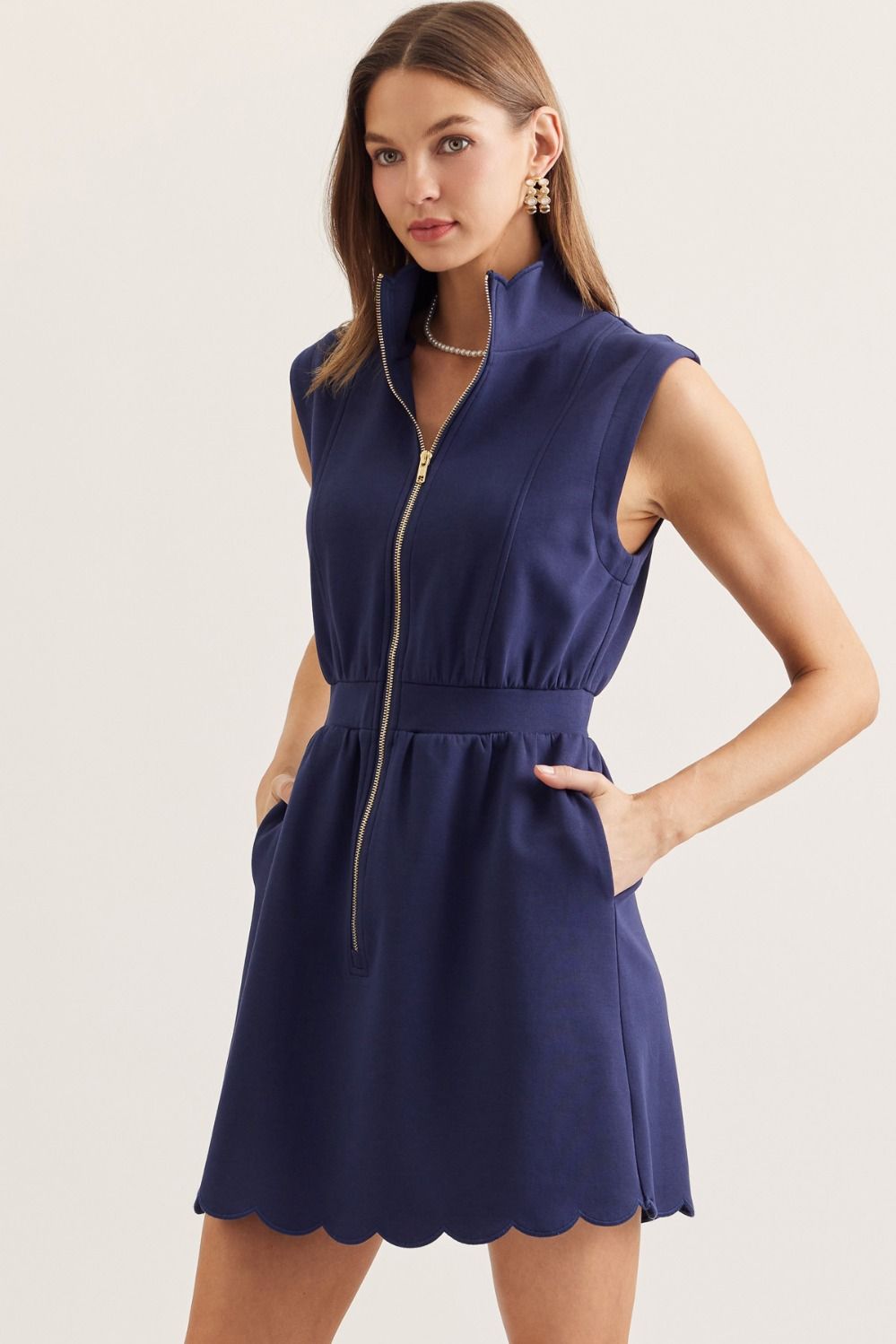 The Ashley Dress combines sporty style with everyday comfort. This sleeveless mini features a flattering quarter zip and delicate scallop detailing for a cute, polished look. Perfect for running errands or casual outings when you want to feel put-together without sacrificing comfort.