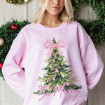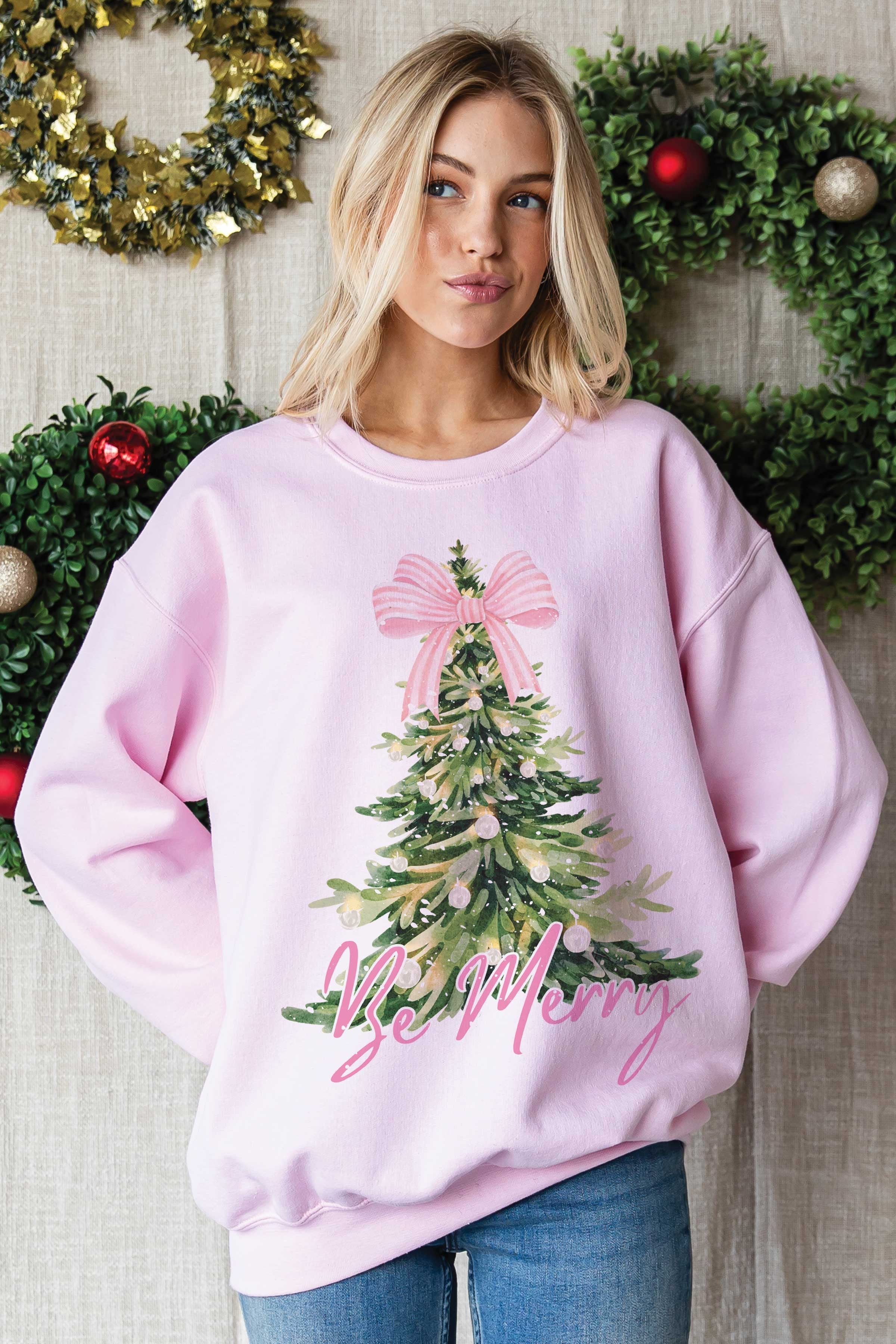 Shine bright this holiday season with our Be Merry Christmas graphic sweatshirt, featuring a festive tree topped with a pink bow and sparkling lights. This women's Christmas crewneck is a cozy winter favorite that adds cheerful charm to every holiday gathering.