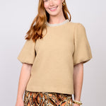 Elevate your wardrobe with this sophisticated puff sleeve top featuring an ornate beaded neckline. The luxurious camel hue pairs effortlessly with any ensemble, while delicate beading adds refined detail. Perfect for dressing up casual looks or layering under blazers for polished sophistication.