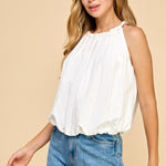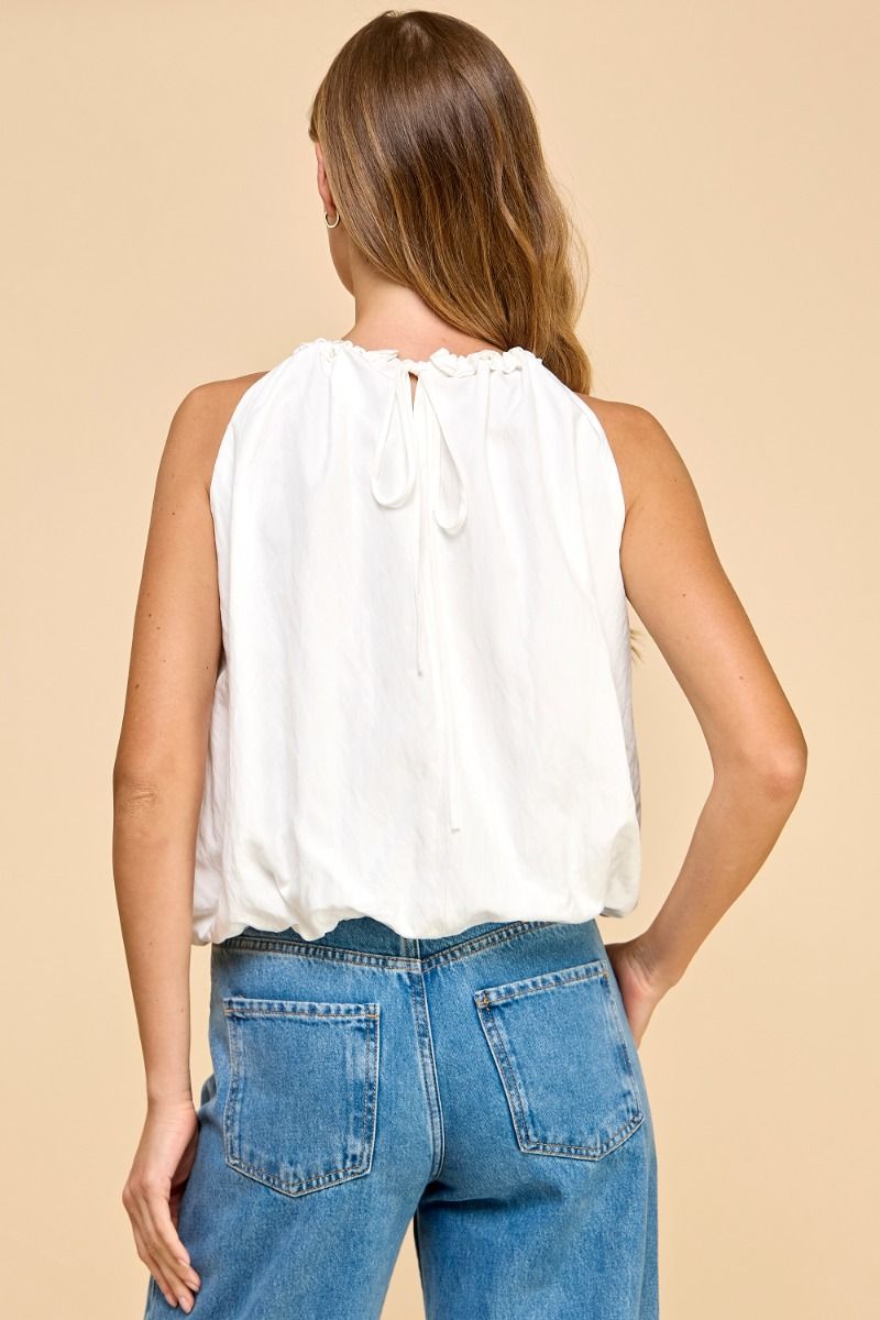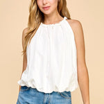 This halter-style top features a gathered neckline with adjustable tie closure at the back and a relaxed, balloon-style hemline.