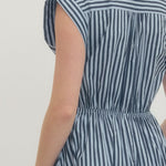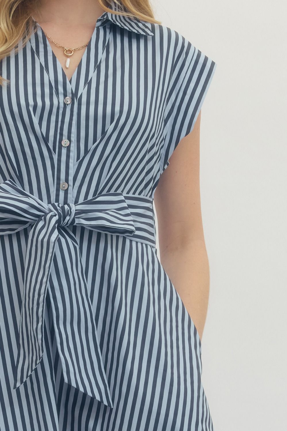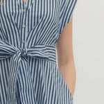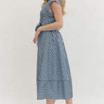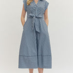 Striped cap sleeve midi dress featuring V-neck with self-tie detail at front and gathered waist. Side pockets. Lined. Woven. Non-sheer. Lightweight.