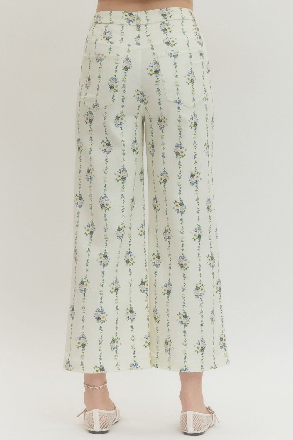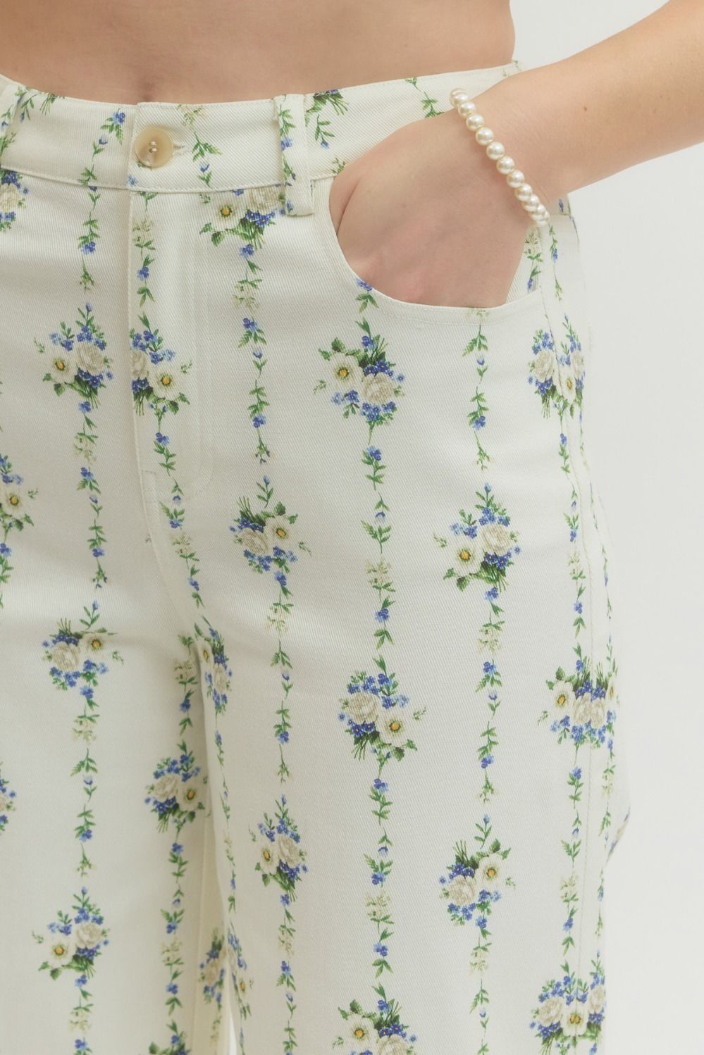 Floral print wide leg pants featuring vertical floral motif. Button closure at front. Side pockets. Back pockets. Unlined. Woven. Non-sheer. Lightweight.