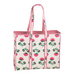 This quilted cotton block print tote features contrast stripe binding, liner and interior pocket.  Opens wide with Flat rectangular Bottom that holds are your goodies!