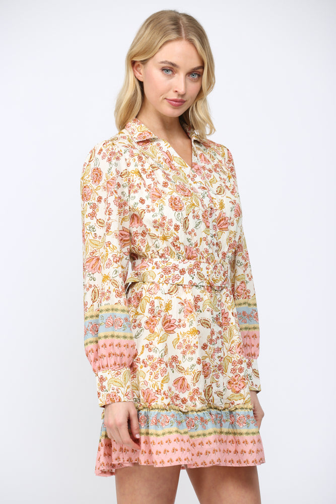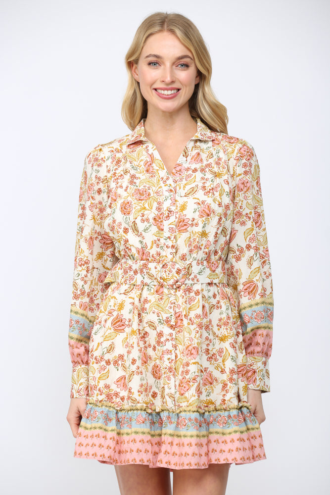 Soft, feminine, and effortlessly charming, the Blooming Meadow Tie-Waist Dress features an allover floral print in warm pastel tones. Designed with a classic collared neckline and button-down front, this long-sleeve dress is cinched at the waist with a self-tie belt for a flattering silhouette. The gently ruffled hem with contrast border detailing adds movement and a playful finish. Perfect for brunch dates, garden parties, or casual daytime outings, this dress blends comfort with timeless elegance.