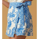 A printed woven skort with side tie and zipper closure. Matching top IT13285 Details: Self : 94% Polyester 6% Spandex Size & Fit - Model is 5`9" And Wearing Size Small - Measurements Taken From Size Small - Approx. Length: 14", Inseam: 2.5"