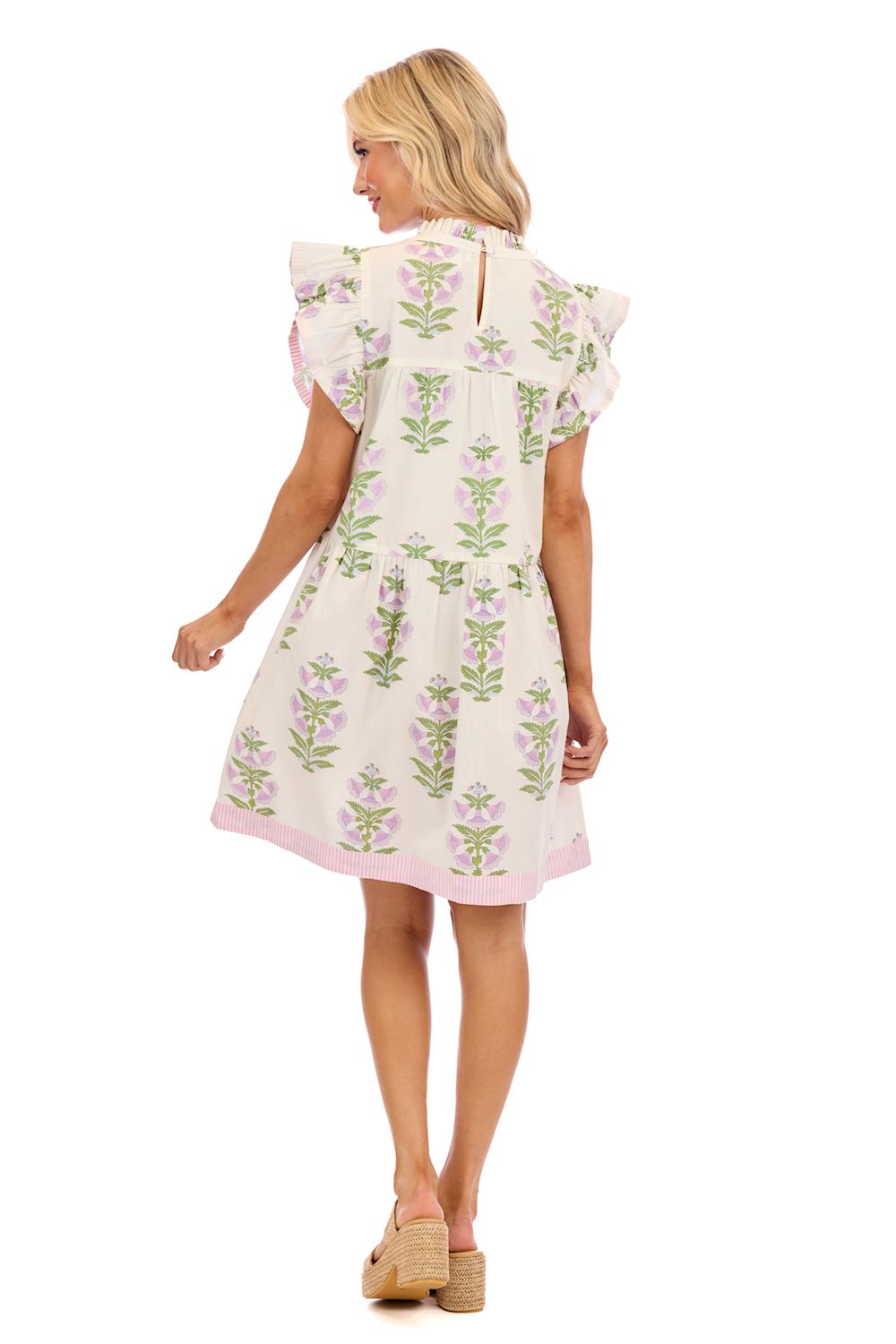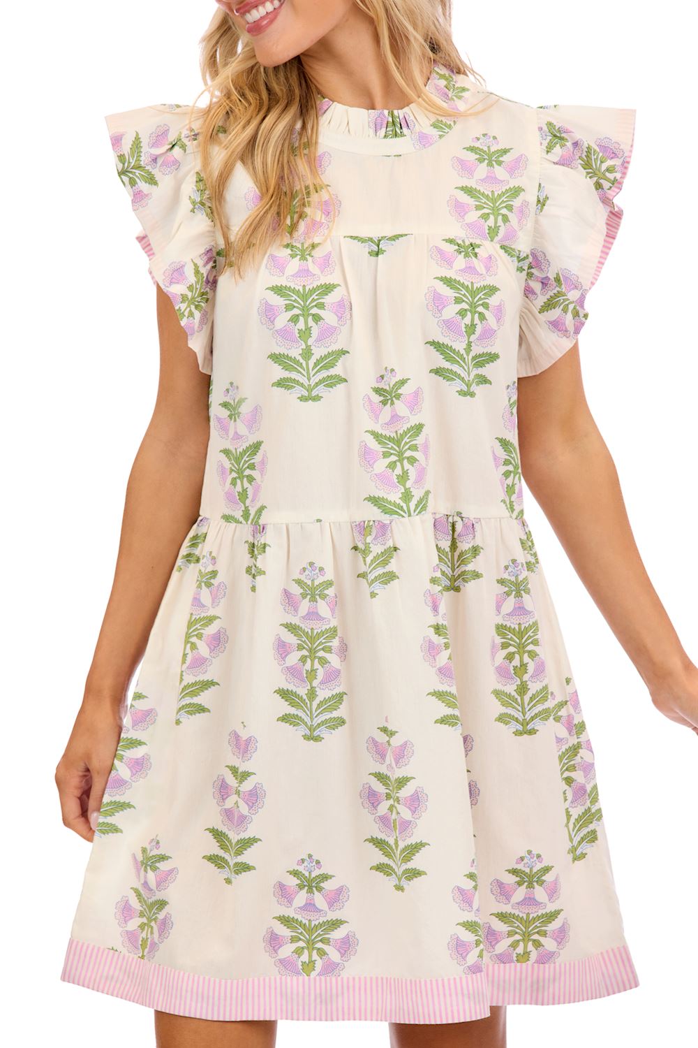 Bree Tiered Mini Dress Elevate your wardrobe with this charming poplin tiered dress, designed for effortless style. The flutter sleeves and delicate ruffle neckline add feminine flair, while the contrast bottom hem creates visual interest. Perfect for casual outings or dressed-up occasions, this mini dress offers a flattering silhouette with movement and texture. Size small measures approximately 35 1/2" from shoulder to hem. A versatile piece that transitions seamlessly from day to night.