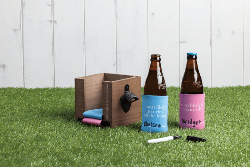 Can Opener Hugger Holder 3-piece set offers a unique and functional addition to your party essentials. The wooden can hugger storage box, crafted from durable pine wood, features an iron bottle opener for easy access to your favorite beverages. It also includes a convenient well to hold the included permanent marker, ensuring guests can personalize their drinks effortlessly. The set comes with four neoprene can huggers, each adorned with "most likely to" prompts, adding a fun and interactive element to any gathering. The box measures 7" x 5 1/4", providing ample space for storage, while the can coolers measure 5" x 4", perfectly fitting standard-sized cans. Ideal for parties, picnics, or casual get-togethers, this set combines practicality with a touch of whimsy, making it a must-have for any host or hostess.