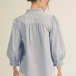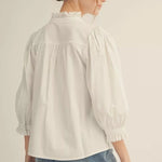 Effortless style meets playful charm with this three-quarter sleeve button-up top. The crisp solid fabric pairs beautifully with delicate eyelet contrast accents that add a touch of feminine flair. Perfect for layering or wearing solo, this versatile piece transitions seamlessly from casual weekends to polished weekday looks. The relaxed fit and breathable material keep you comfortable all day long.