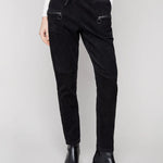 Boost your casual style this fall with these black corduroy jogger pants. With a soft texture and a chic design, these joggers feature adjustable drawstrings at the waist for comfort and zipper pockets for a sleek touch. The stretch fabric offers a flattering fit thats perfect for all-day wear.
