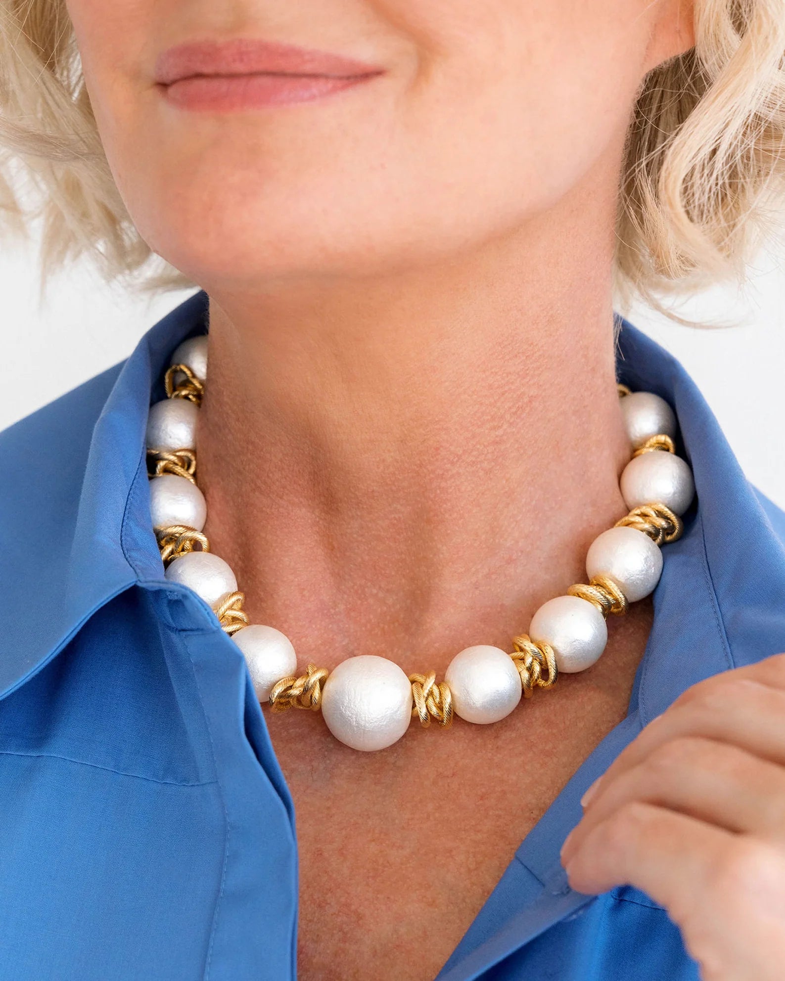 For the cotton pearl fan; it doesn't get anymore classic. Pull together any look with this statement necklace. The best part about it: it's so lightweight you'll forget you're wearing it.