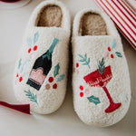Bring the party with these holiday slippers that blend cozy comfort and cocktail chic. Featuring fun and flirty embroidered icons like coupes and holly sprigs, these wholesale slippers are a dream for the festive fashionista. Lined with soft fuzzy sherpa and finished in neutral tones with a pops of color, they’re the perfect mix of festive and comfy.