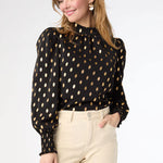 Add some shimmer to chilly days with the Darina Metallic Dot Blouse! Soft and cozy, this playful top brightens your fall wardrobe with sparkling metallic dots that catch the light just right. Perfect for layering or wearing on its own, it brings a fun pop of glam to your winter looks without sacrificing comfort. Get ready to sparkle through the season!