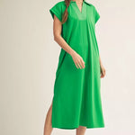 Effortless elegance meets everyday comfort in this drop shoulder midi dress. The relaxed silhouette skims your frame while the side slit adds just the right amount of movement and flair. Practical side pockets keep your essentials close, while the stitch-detailed front neckline and collar bring subtle visual interest. Perfect for casual outings or dressed up with your favorite accessories—this solid midi is your new go-to piece.