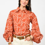 Elevate your style with the Elaina Rusty Vines Top, featuring a bold big collar and a charming button-down front. The long balloon sleeves add drama, while delicate ruffle details bring a playful touch. Crafted in a warm rusty vine print, this top effortlessly blends comfort and whimsy for your standout look.