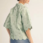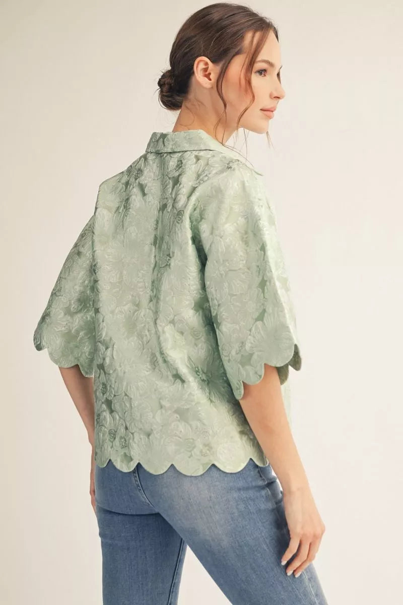 Drop shoulder floral jacquard top with scallop edge detail.