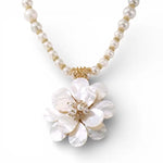 ▫️Ellie Necklace ▫️Length: 20" + 3" Extender ▫️Weight: 3.5 Ounces ▫️Lightweight Ivory Glass Pearl ▫️Hand Made Mother of Pearl Flower Pendant ▫️Vintage 14k Gold Plated Hardware ▫️Lobster Claw Clasp