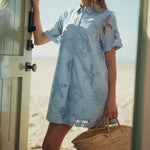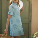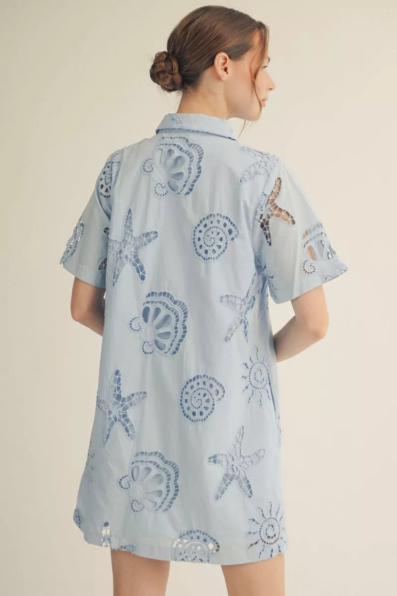 Short sleeves front button up eyelet summer dress with front pleat detail.