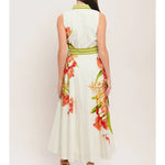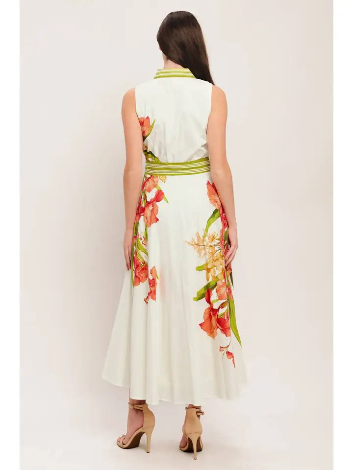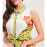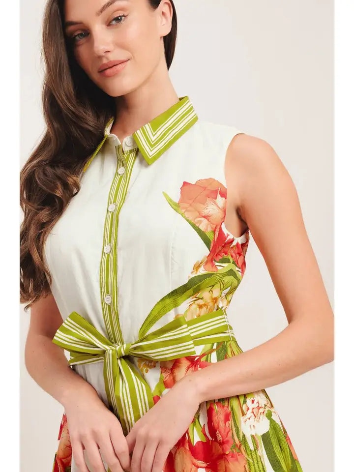 A printed woven midi dress featuring collar, sleeveless, front button down, self sash tie and circle skirt Details: Self : 100% Cotton Lining : 100% Polyester Size & Fit - Model is 5`8" And Wearing Size Small - Measurements Taken From Size Small - Approx. Length: 50"