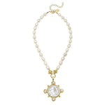 Experience the elegance of Susan Shaw's Gold and Silver Coin and Freshwater Pearls on Genuine Freshwater Pearl Necklace. Inspired by Northern European styling, this Pendant/Charm Necklace showcases a harmonious blend of precious metals and pearls. Handmade by skilled artisans in San Antonio, TX, this piece reflects over three decades of jewelry design expertise. Each Susan Shaw piece is crafted with utmost care, meeting the high standards of quality that has made our brand a staple in fine boutiques and gift shops across the United States. Add this exquisite necklace to your collection today.