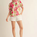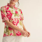 Short sleeves ruffled mock neck floral top, front button, stripe contrast accent.
