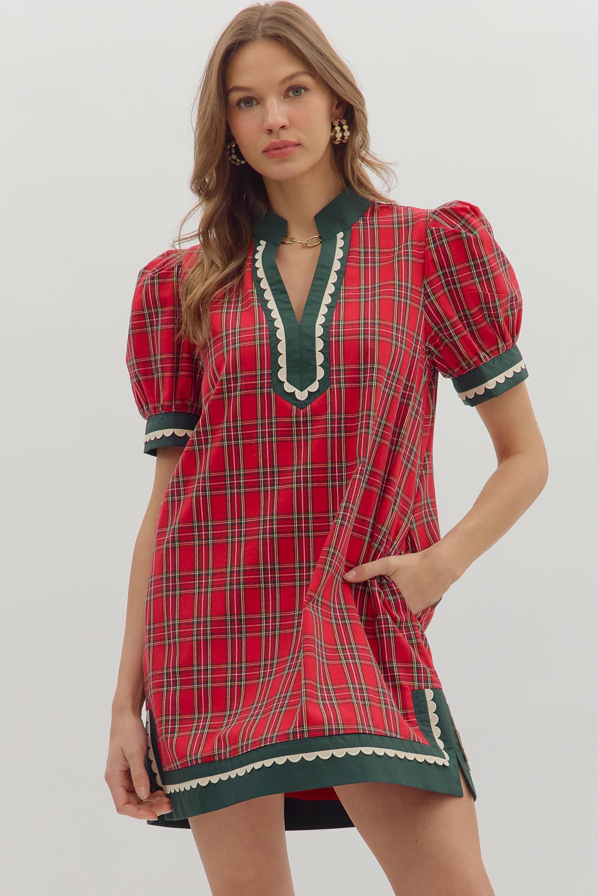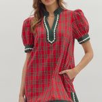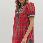 Get ready to sleigh the season in this charming Christmas plaid mini dress! Featuring a classic red-and-green tartan print, this dress is trimmed in festive green for the perfect holiday touch. Delicate ric rac detailing accents the hem and puff sleeves, adding a playful vintage flair. The puff sleeves give it a sweet, feminine silhouette, while the mini length keeps it flirty and fun. Perfect for holiday parties, family gatherings, or cozy celebrations by the tree!