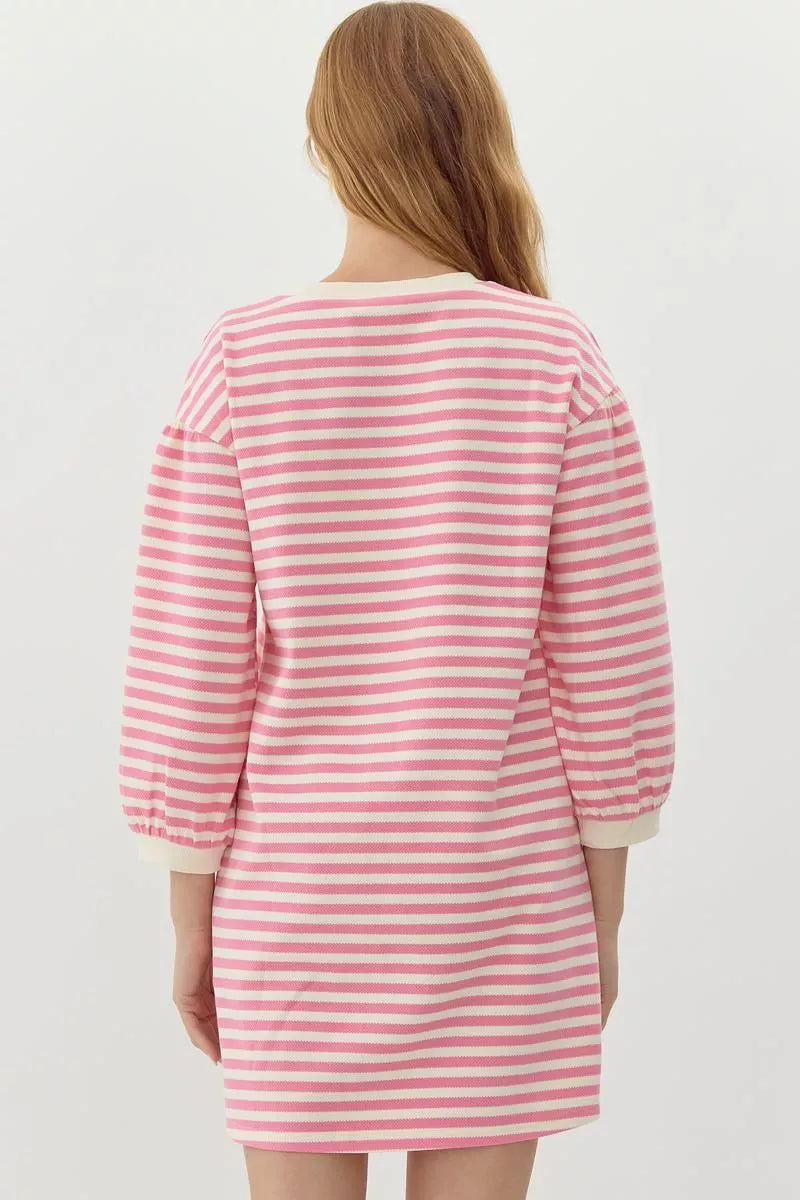 Effortlessly chic and playfully styled, the Jane Shirt Dress brings together timeless stripes with modern details that actually work. The crew neckline and drop shoulders create a relaxed silhouette, while puffed three-quarter sleeves add a touch of personality. Practical side pockets keep your essentials close, and snug band cuffs finish the look with polish. Perfect for casual days that call for something a little extra.