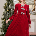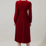 Celebrate in style with this perfect midi dress. A soft and stretchy velvet fabric that shapes long sleeves, a round neckline, and a princess-seamed bodice adorned with cute bow-inspired details and flirty keyhole cutouts at the center. It’s so cute to wear with some heels and long earrings to enjoy the day or night! - Bow - Balloon sleeves - Midi - Zipper
