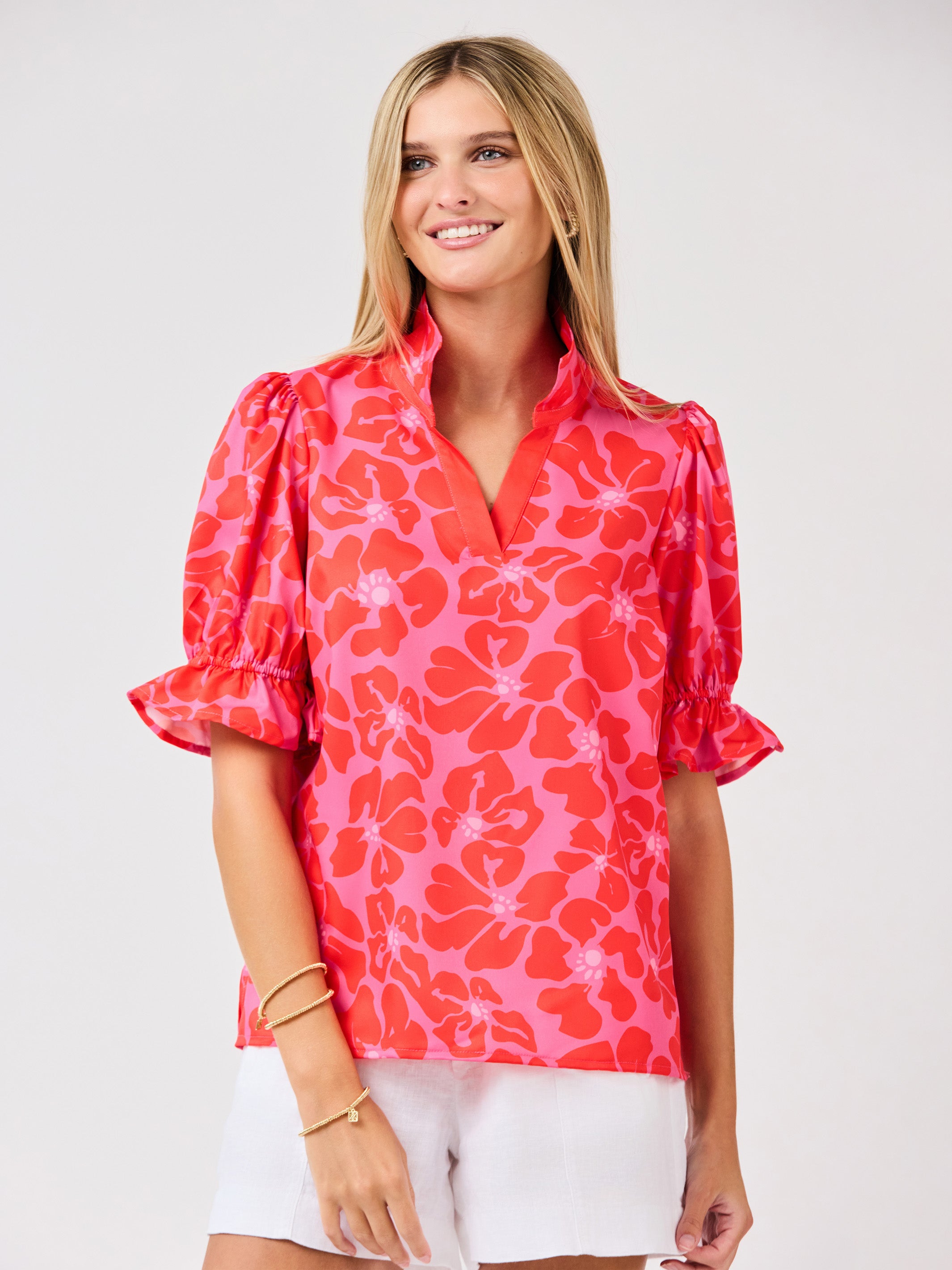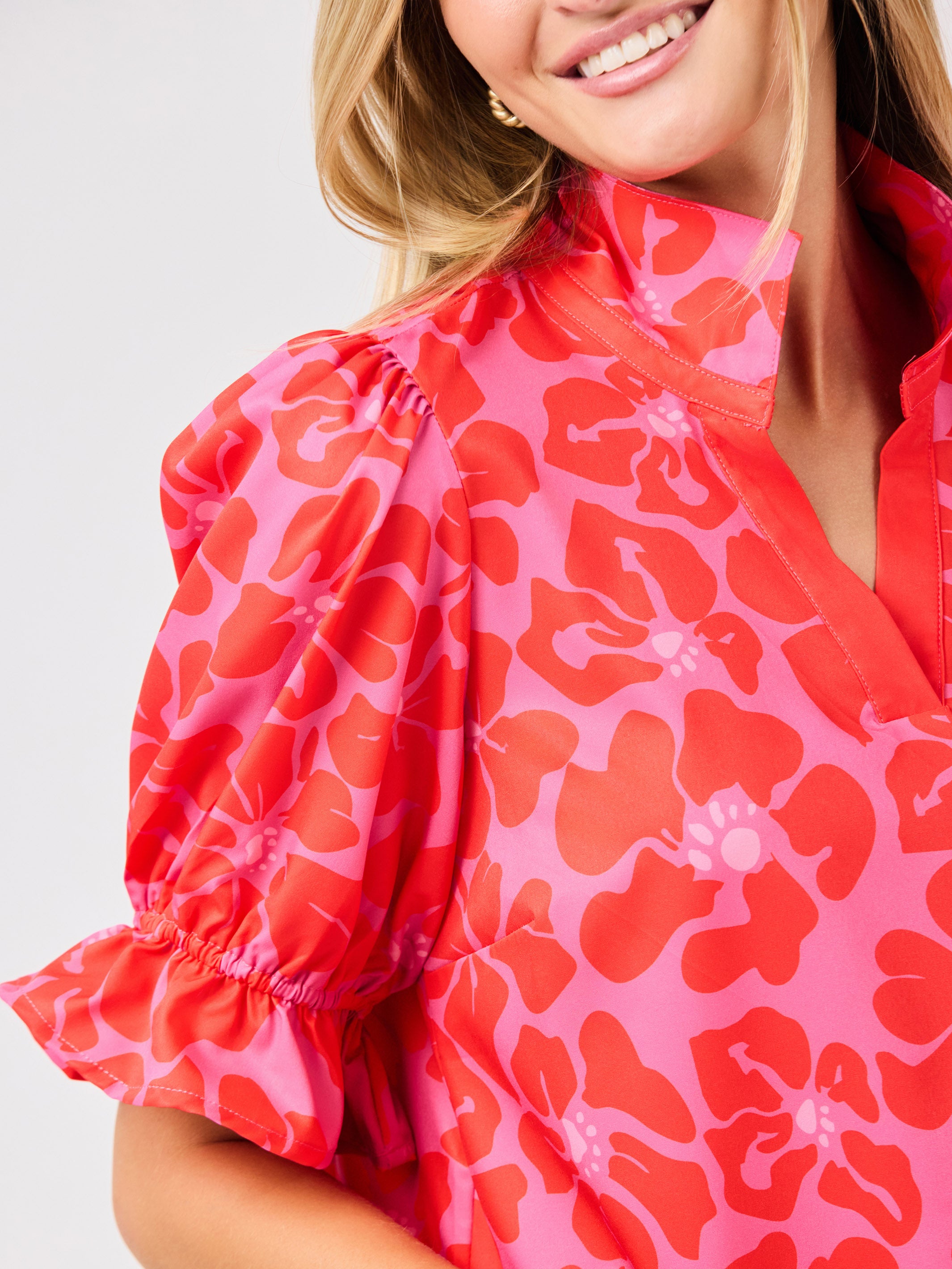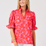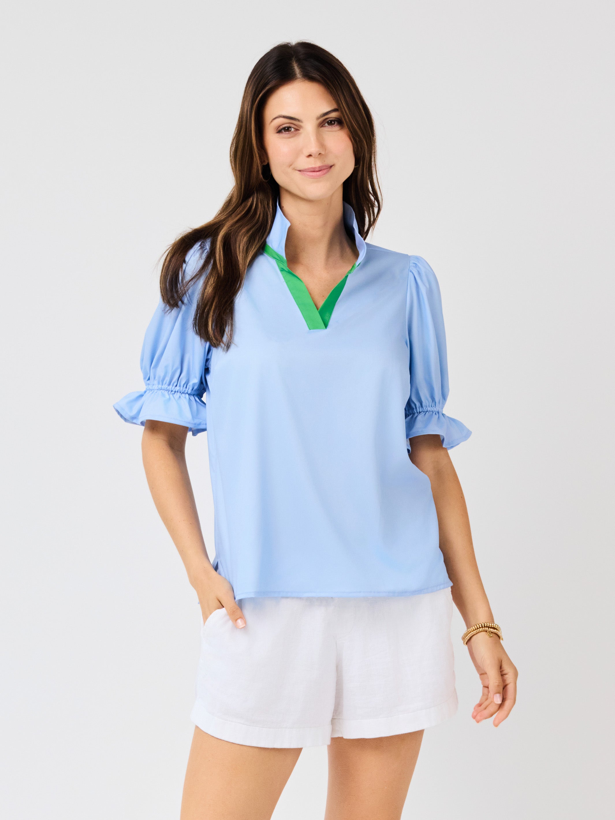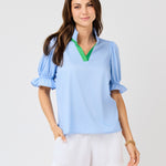 The Jessica Top is the perfect blend of cute and stylish. With short puff sleeves and a contrast pink collar, this green top will add a pop of color to your wardrobe. The v neck adds a touch of femininity, making it a versatile piece for any occasion.