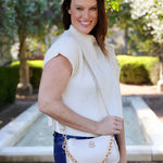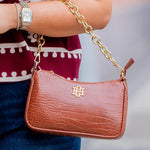This fabulous vegan leather crossbody is a wonderful size for travel and everyday wearing! It is made with a slightly metallic, textured vegan leather. There is a removable chain accent that can also be used as a carrying strap as well. The crossbody strap is adjustable and removable as well. It features the Caroline Hill logo on one side and has a top zipper closure. The interior of the bag has a zippered pocket and two short open pockets as well.