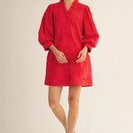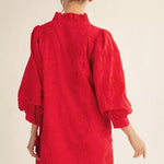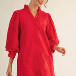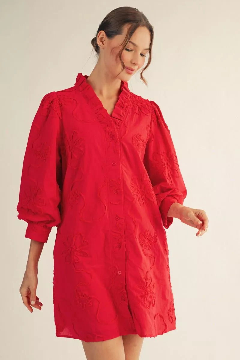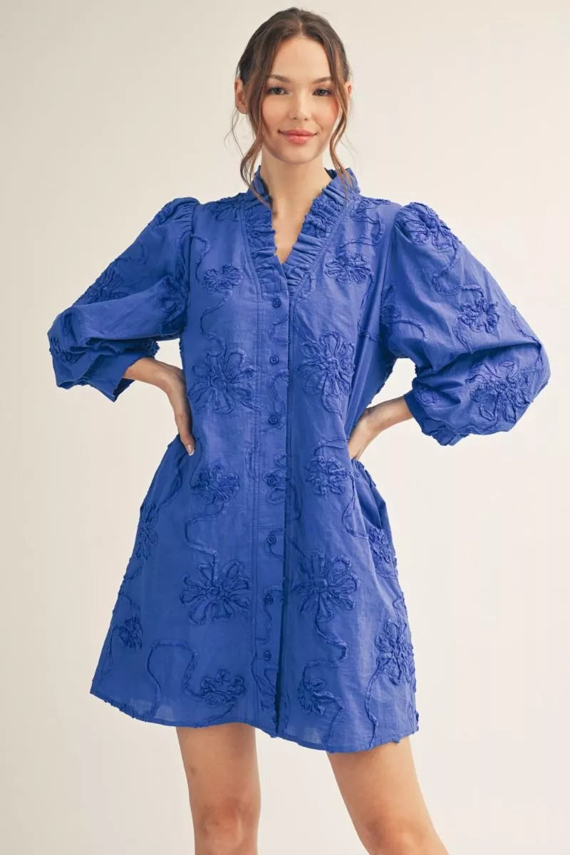 3/4 puff sleeves button down 3D floral dress with ruffled neckline, side pockets.