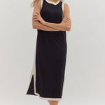Effortless elegance meets fun with this solid sleeveless midi dress! Contrast binding frames the neckline and armholes for a polished pop of style, while a cheeky side slit keeps things interesting. Crafted from lightweight knit that moves with you—no lining needed—this non-sheer beauty is perfect for everything from casual outings to dressed-up occasions. Simple, comfortable, and ready to become your new go-to.