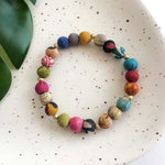 Colorful Kantha beads are clustered in groups of three, each separated by a tiny metallic glimmer bead, to form this beaded bracelet. • Measures .375" wide; stretches to fit most wrists. • Sustainably handmade from repurposed cotton Sari & Kantha textiles by women artisans in India. • Colors & patterns will vary due to repurposed textiles.
