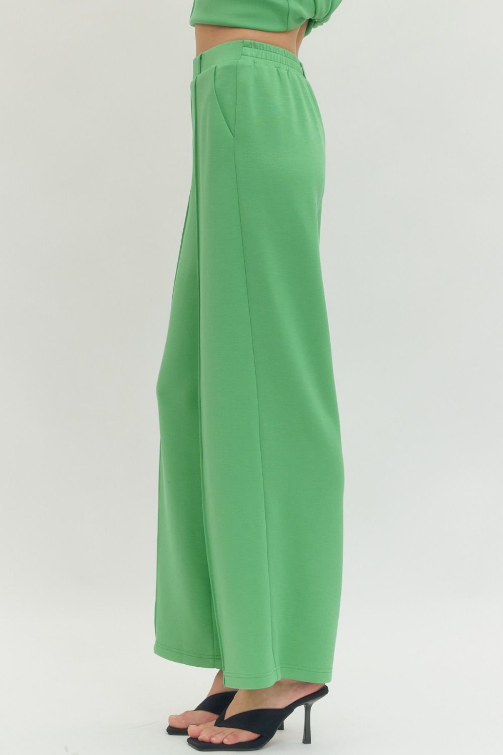 Effortless two-piece set featuring a solid knit sleeveless mock neck top with front center seam, paired with wide-leg pants. Pants include side pockets, elastic back waist, and matching front center seam for a coordinated look. Perfect for layering or wearing as a complete outfit.