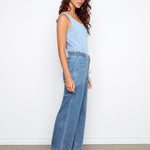 Effortless style meets comfort in the Kiera Drawstring Wide Leg Pant. Featuring a relaxed wide-leg silhouette with an adjustable drawstring waist for a customizable fit, these denim pants offer versatile everyday wear. Functional patch pockets add practical storage and a classic touch. Perfect for casual outings or laid-back weekends, this piece transitions seamlessly from day to night.