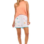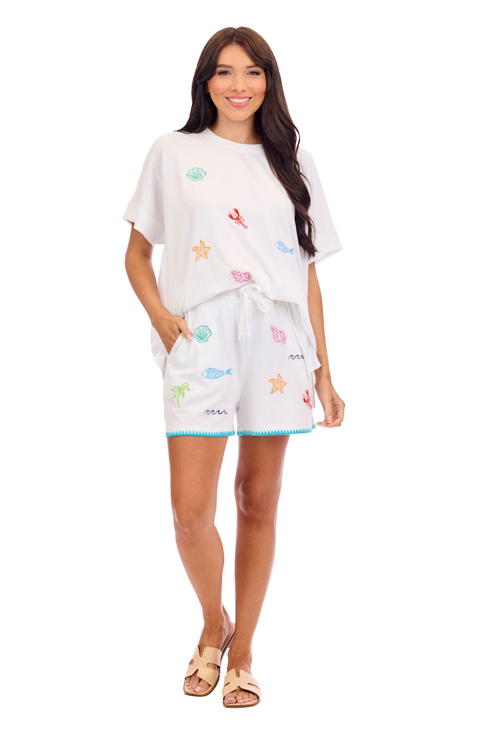 Let's get summer started with these embroidered icon cotton blend shorts. featuring triangle hem embroidery, side pockets with pull-on elastic waist with ties. Inseam measures approximately 3" on size small.