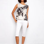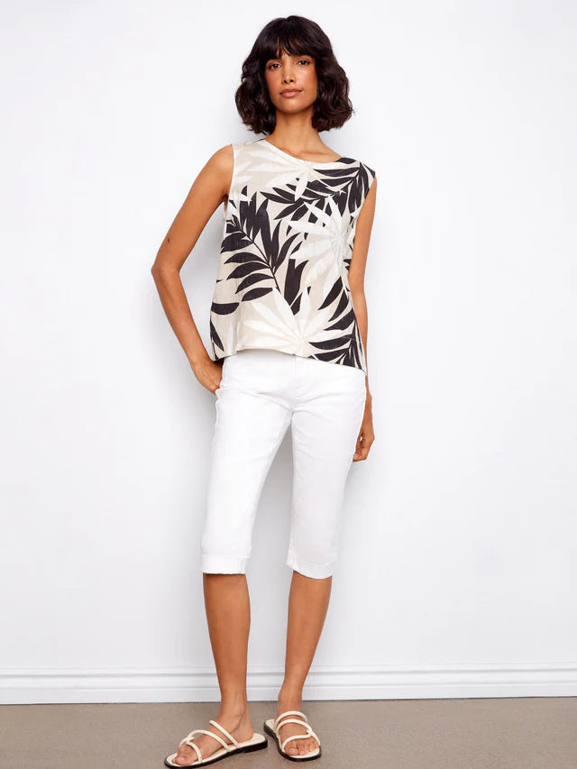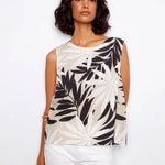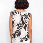 Refresh your wardrobe with this sleeveless linen blend blouse, featuring the elegant beige and black Leaflet print. Distinctive back buttons add subtle charm, making it a perfect choice for sunny days. Lightweight and versatile, it blends style and comfort effortlessly for any spring or summer occasion.