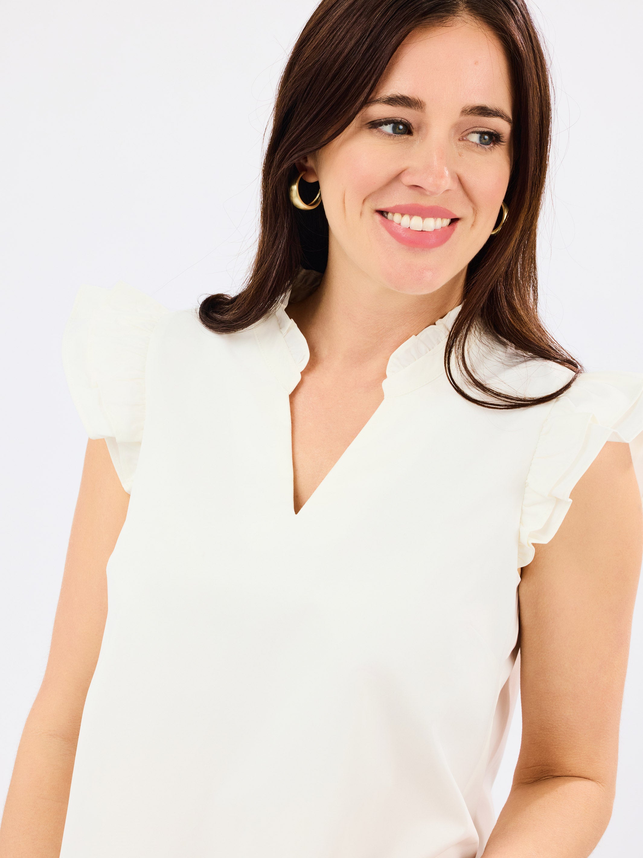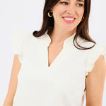 The Leigh Top offers a fresh, stylish take on classic design. With its flattering V-Neckline and ruffle cap sleeves, this top exudes a touch of femininity. The easy A-line body ensures a relaxed, comfortable fit, while the dobby fabric adds a textured, lightweight feel.
