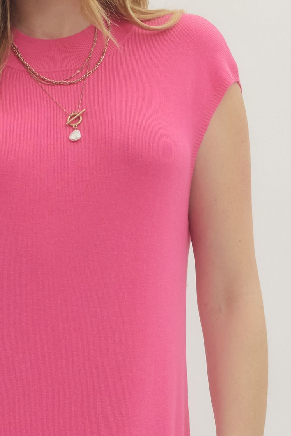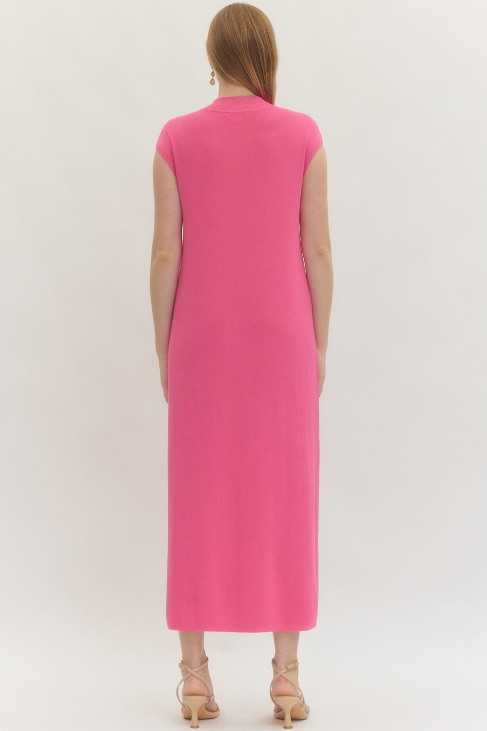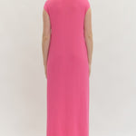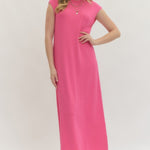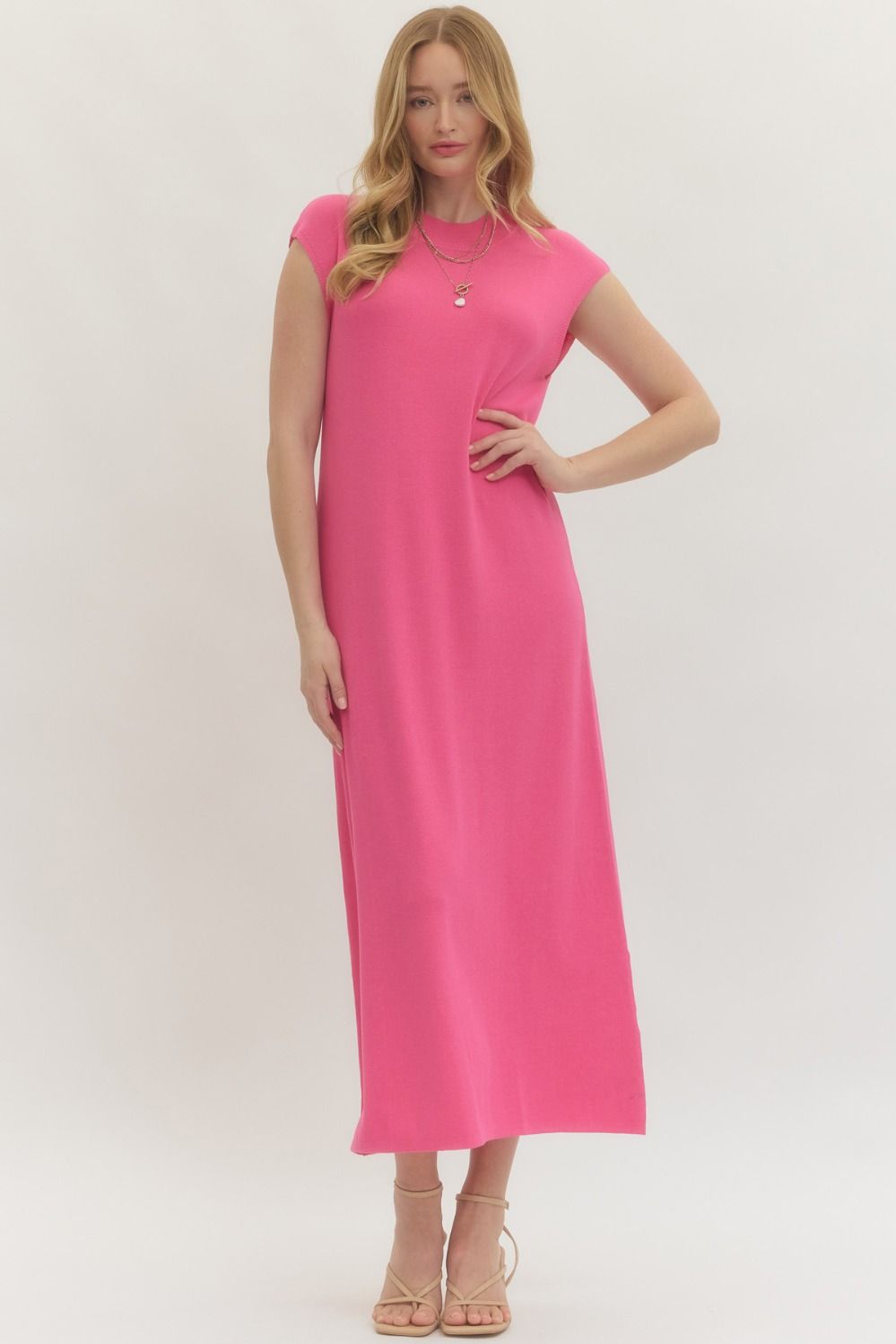 Solid cap sleeve long dress featuring extended shoulder design. Side pockets. Unlined. Knit. Non-sheer. Medium weight.