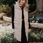 Stay cozy and stylish with this long quilted puffer vest, perfect for layering over your favorite outfits. Its sleek design adds a fun twist to any basic look, keeping you warm without sacrificing flair. Elevate your wardrobe effortlessly with this playful, must-have piece!