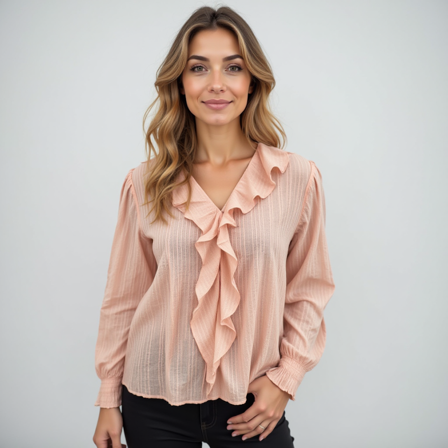 The Maria Blouse brings a playful touch to your wardrobe with its charming ruffle collar cascading down the front. Available in soft blush or creamy tones, this blouse features long sleeves finished with flirty ruffle bell cuffs, perfect for adding a little twirl to your day.