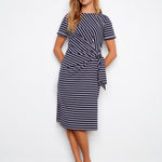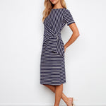 The Marina Tie Dress brings effortless charm to your wardrobe with its playful striped pattern and relaxed boat neck silhouette. Short sleeves with finished cuffs keep things polished, while the tie detail adds a flirty twist that works equally well dressed up or down. Perfect for weekend adventures or casual office days, this versatile piece transitions seamlessly from season to season.