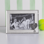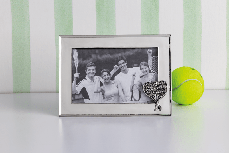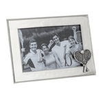 Metal Tennis Frame. This elegant silver-finished aluminum frame is designed to showcase your cherished memories with a touch of sophistication. The frame features a unique layered metal icon that adds a stylish accent, making it a perfect addition to any home or office decor. It holds a 4" x 6" photo, allowing you to display your favorite moments with ease. The easel back ensures stability and versatility, enabling you to place it on any tabletop or shelf. Ideal for tennis enthusiasts or anyone who appreciates a sleek, modern aesthetic, this frame is a thoughtful gift or a personal keepsake.