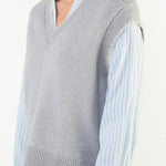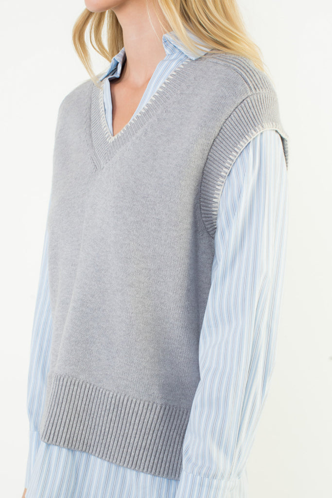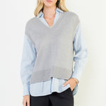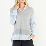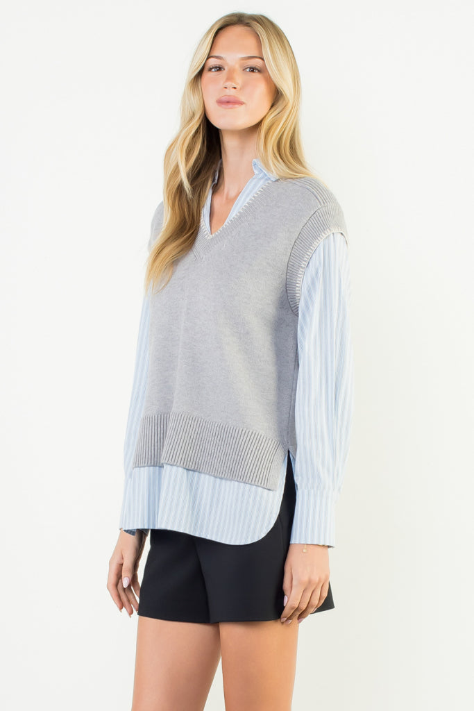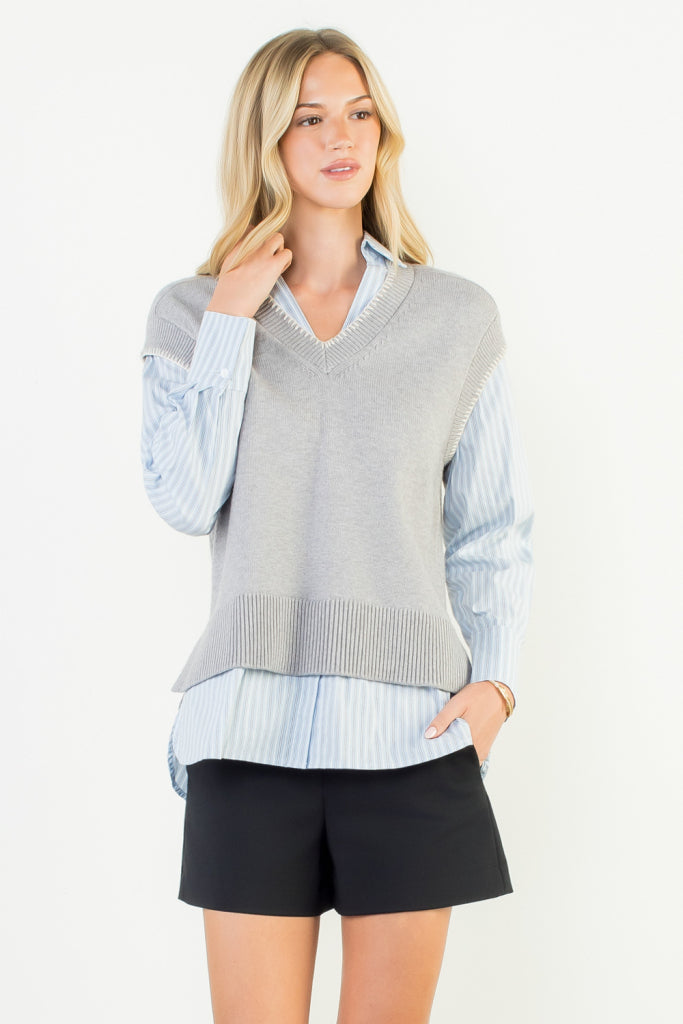 This playful Mixed Media Knit Top combines a charming striped blouse with a cozy grey knit vest layered over it. Perfect for adding fun dimension and texture to your outfit, it creates an effortlessly cute and stylish look that's great for casual days or vibrant weekends. Embrace the layered vibe with comfort and flair!