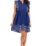 The Oakes Embroidered Dress is a charming addition to any wardrobe, crafted from soft and breathable 100% cotton cambric. This dress showcases exquisite embroidery detailing on the flutter sleeves and hem, adding a touch of elegance and sophistication. The V-neck design is complemented by a pearlized button chest placket, offering a classic yet modern look. With a length of approximately 25 1/2" from shoulder to hem, it provides a flattering fit for various body types. Available in sizes S, M, and L, this dress is perfect for both casual outings and special occasions, ensuring comfort and style throughout the day.