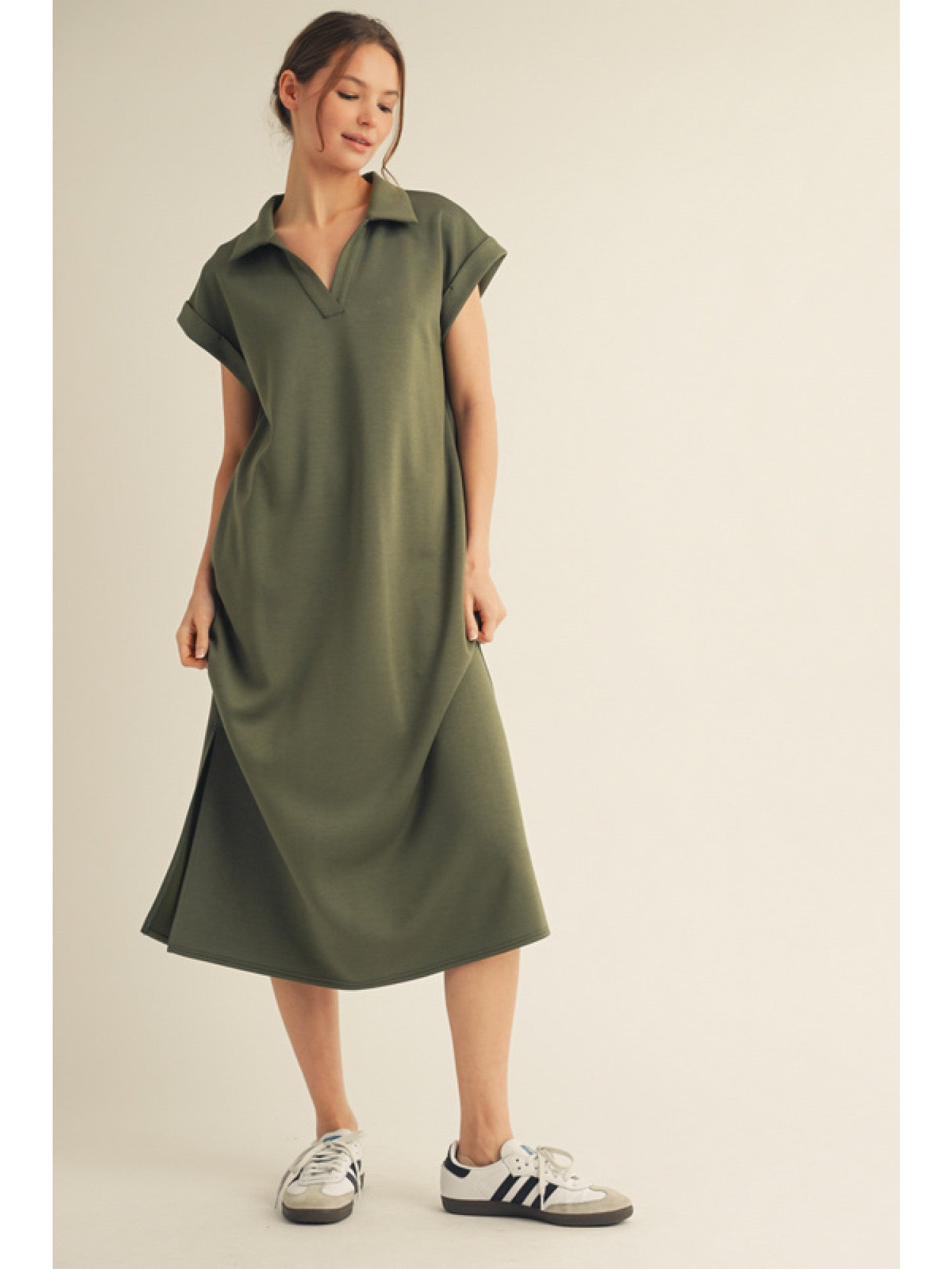 Solid midi dress with open collared neck, side pockets, short kimono sleeves, band cuffs, and side slit detail. - Non-sheer, lightweight. - Model is 5'10'' and is wearing a Small.